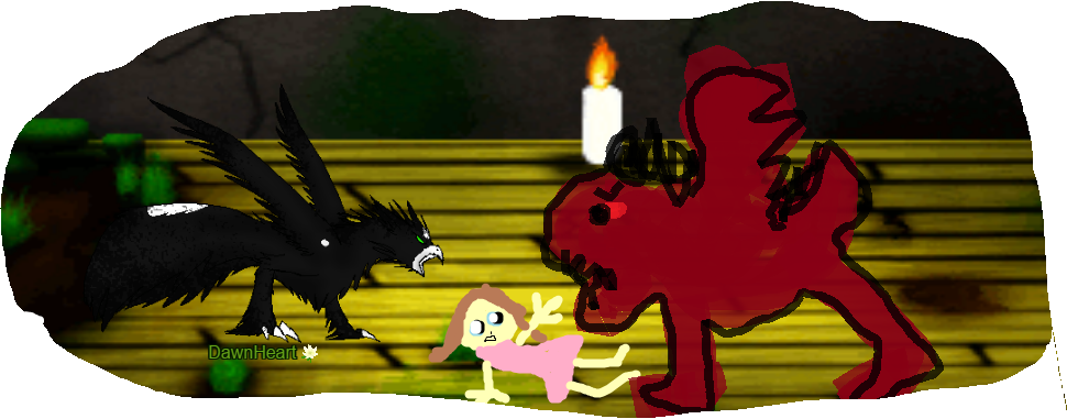 Screech: Augh!!!!!!!!!!!!!!!! Other Human: -Whaps Screech with whip- Ya! Get away!!!!!! -takes girl to home- Girl: But wait Mister!!! Screech: -Flies away-